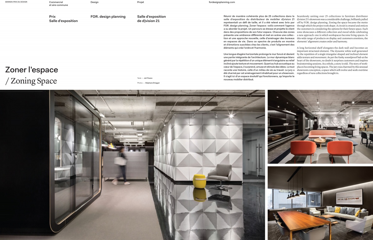 By winning the Grand Prix du Design in the showroom category, FOR. is featured in the latest edition of the INTÉRIEURS magazine: ''Seamlessly uniting over 25 collections in furniture distributor d|vision 21’s showroom was a considerable challenge, brilliantly pulled off by FOR. design planning. Zoning the space became the motto through which the project took shape. A circuit is created and entices the customers in considering the options for their future space. Each zone showcases a different collection and mood while celebrating a new approach: one in which workspaces become living spaces. In this wide range of products on display and customers emotions, the elements’ alignment creates order and harmony. As a whole, a story is told. The story of workplaces becoming living spaces. The jury was charmed by this unusual showroom conception, a space which will evolve and work overtime regardless of new collections brought in.''