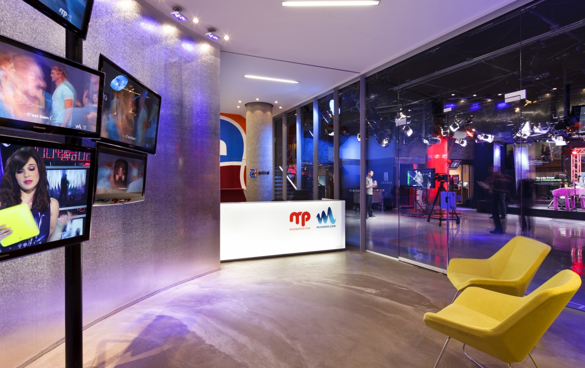Develop a new "Branding" image for the recently acquired television music station by Astral Media. Offer a new experience to their listeners by creating a new reception space entirely open to the recording studios with many lighting options for various recordings.