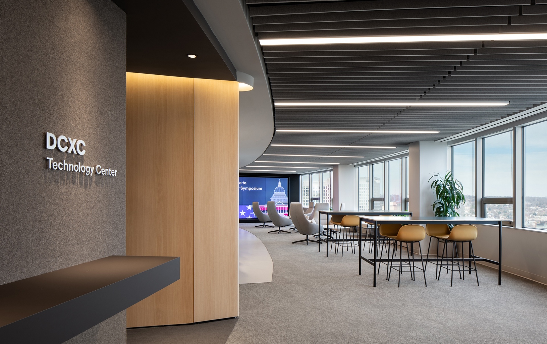 C’est au 25e étage d’un édifice tout en courbes que les équipes ainsi que les clients américains se retrouvent, connectent et se forment. FOR. a conçu un parcours suivant les rondeurs architecturales du bâtiment et des murs rideaux, maximisant ainsi la vue sur les principaux monuments de Washington et les hélicoptères présidentiels.